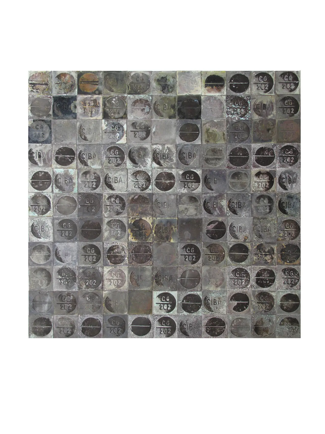 This artwork has been created in the studio utilising etching and corrosion processes on zinc plates which are then mounted onto wood. The resulting colours are natural pigments developed by chemical reaction.