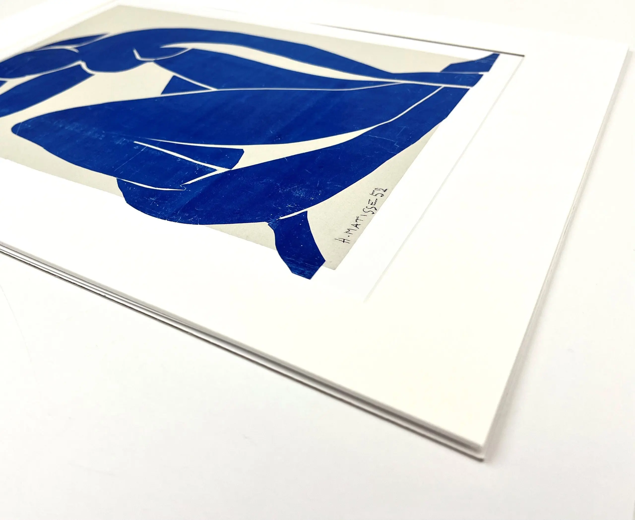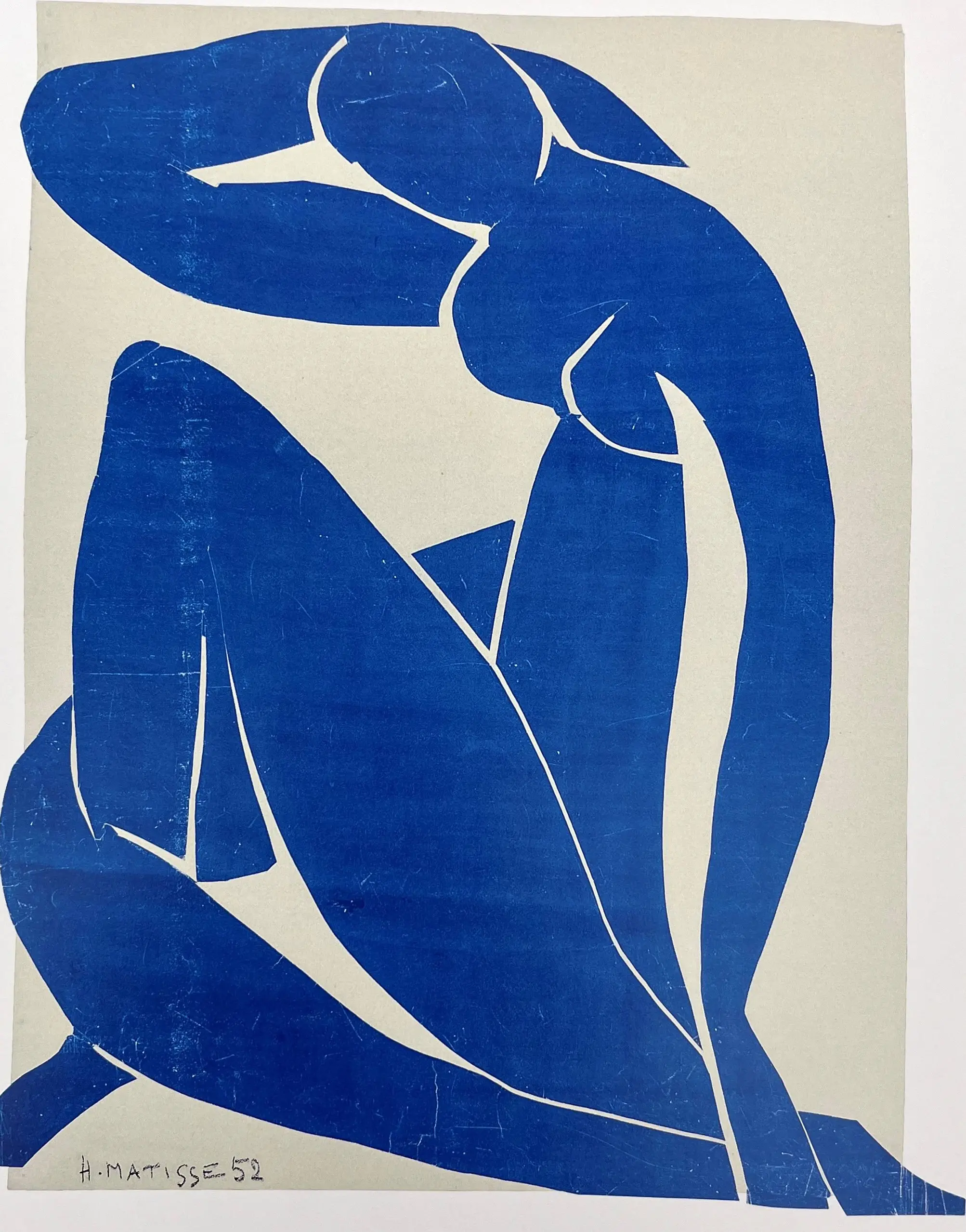 Following surgery for stomach cancer in 1941, Henri Matisse was left bed-bound and could no longer paint or sculpt. With the help of his assistants, he began creating art again. Using scissors, the artist would cut shapes from sheets of paper painted with gouache colours. The seated figure in ‘Blue Nude II’ is similar to several compositions produced by Matisse in the early 1920s, such as the nude figures depicted in his monumental oil painting ‘Le bonheur de Vivre’.