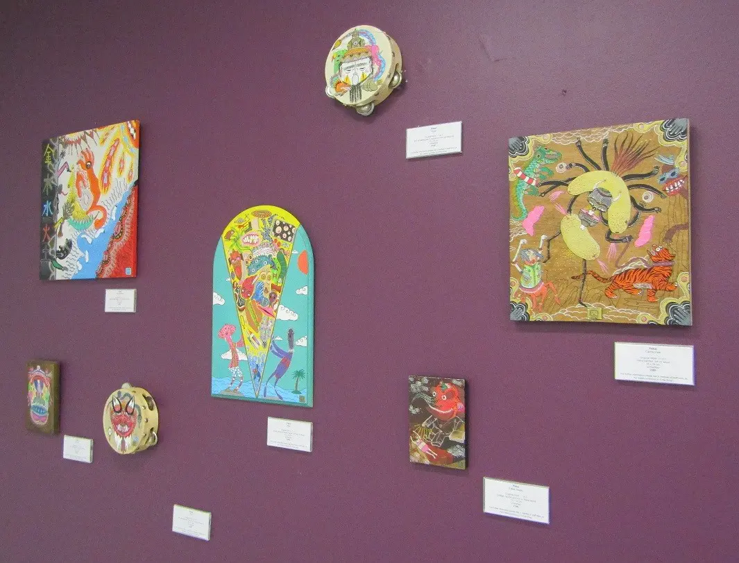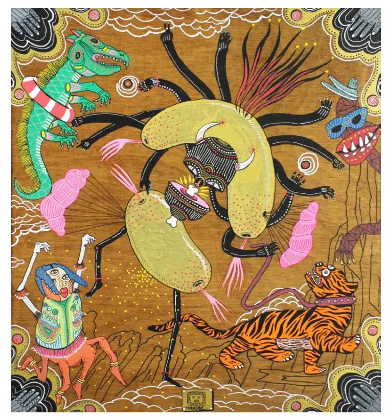 Pakal is the alter ego of an established street artist. It is a means of alternative expression by the artist. Pakal chooses not to reveal his or her identity to let the artworks exist within their own autonomous context, and to avoid any comparison with other work produced by the artist. Free from boundaries, borders or labels, the artist invites the viewer to find their own connections with the works. The use of vivid colours, different materials and subject matter connected with the Far East and indigenous art of Central America add to the intrigue.