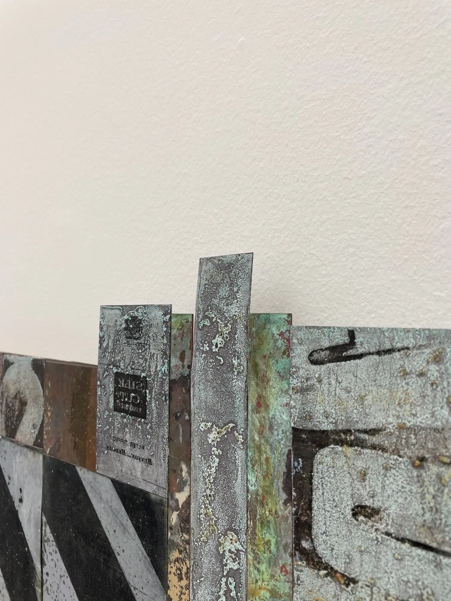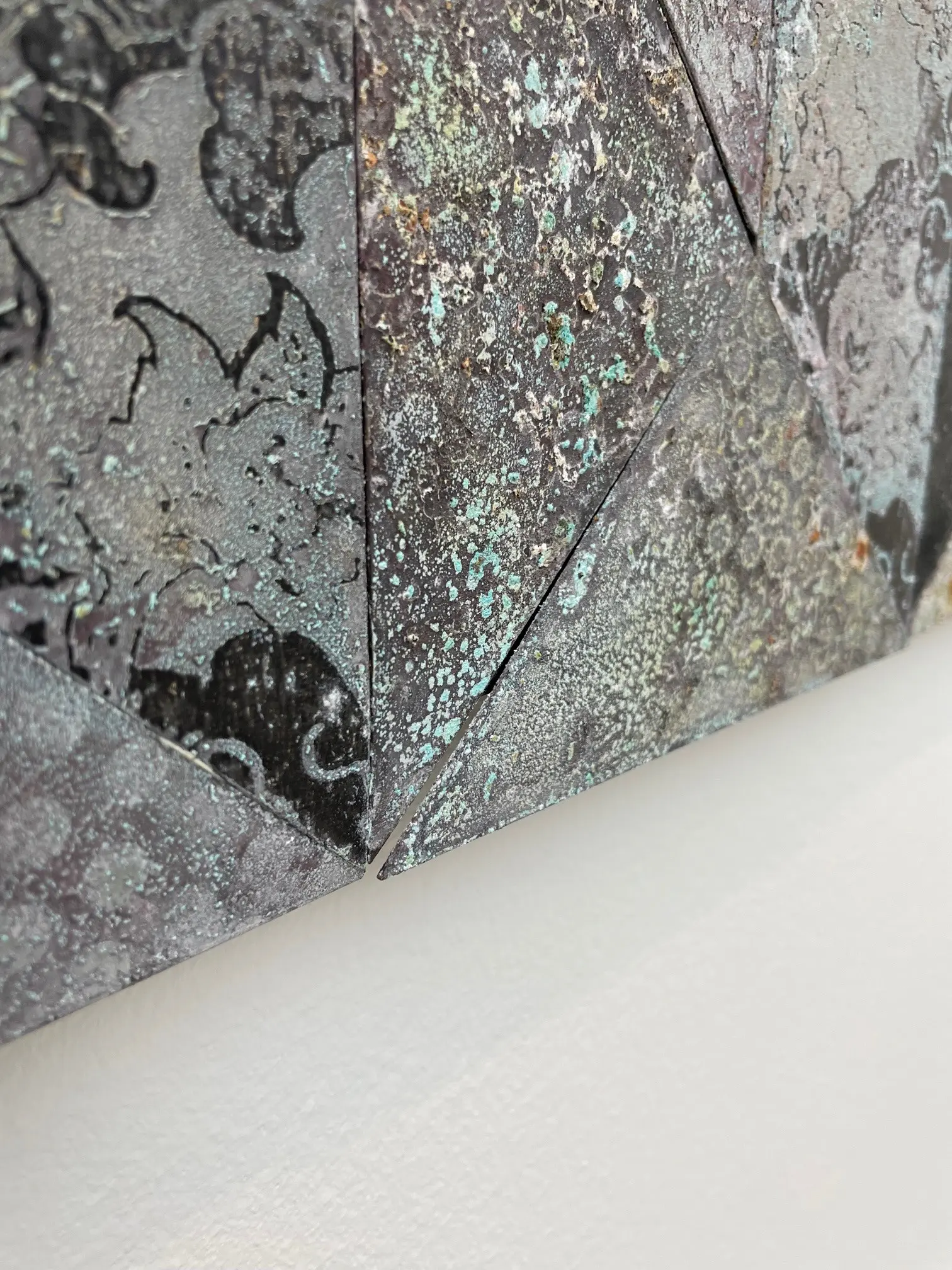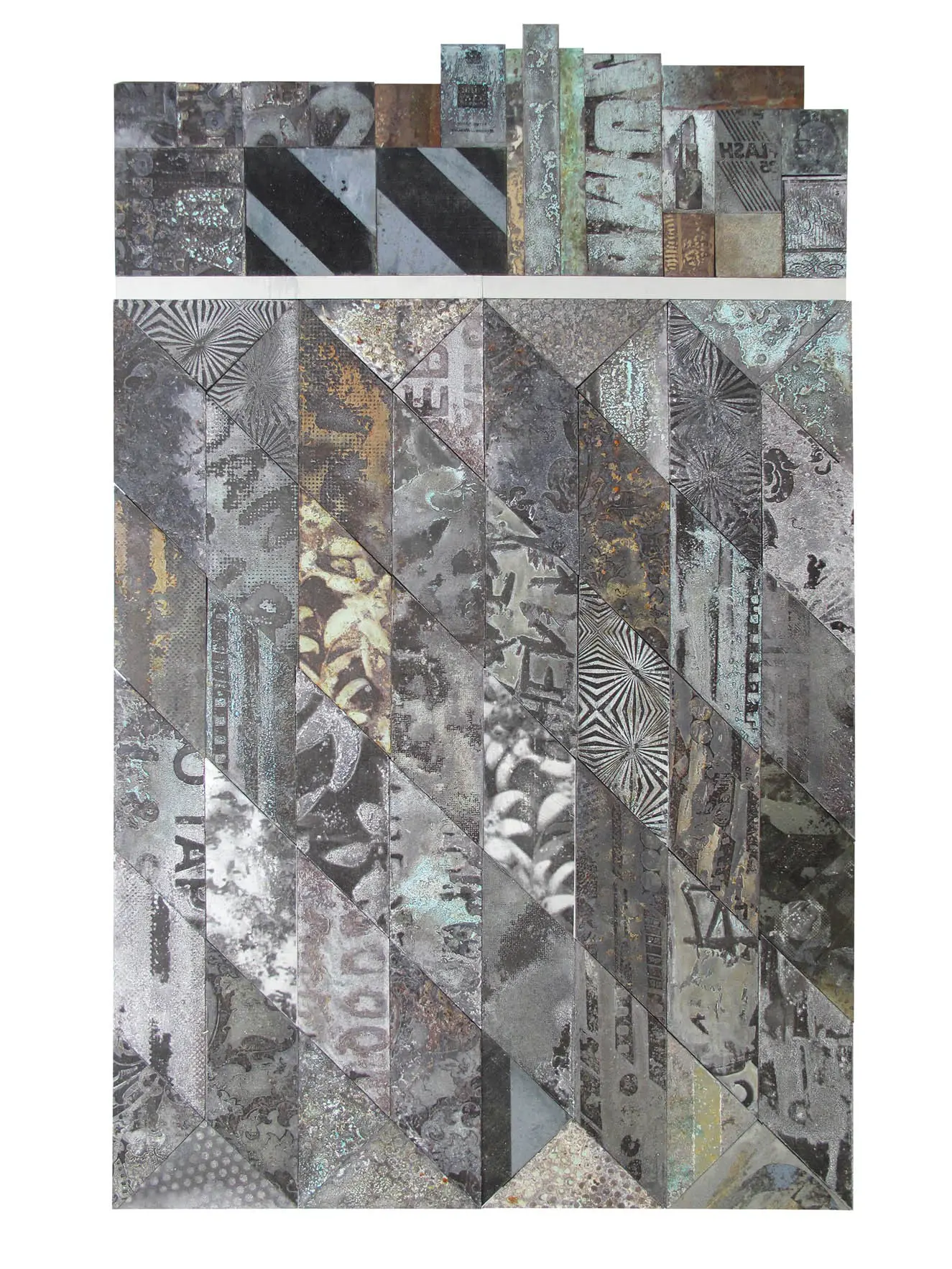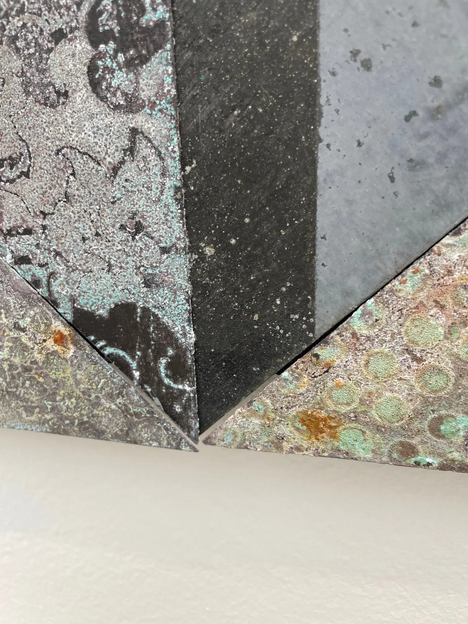 This artwork has been created in the studio utilising etching and corrosion processes on zinc plates which are then mounted onto wood. The resulting colours are natural pigments developed by chemical reaction.