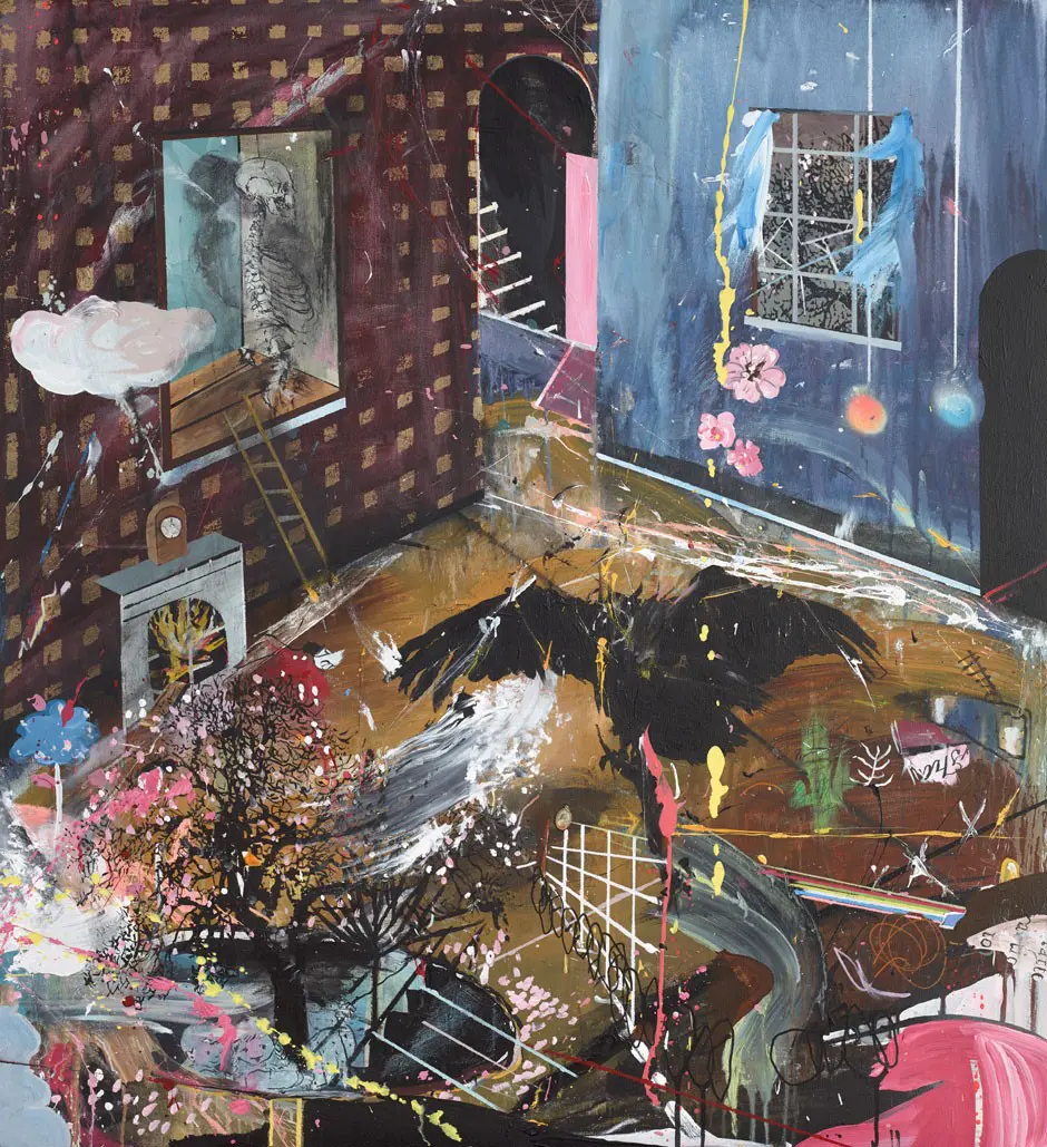 Baldwin’s work reflects the ‘big questions’ of human existence through symbols of death, life and love. Pervading his work are recurring motifs of skeletons, swallows, crucifixes and flowers, that manifest in a composition that is both figurative and abstract.