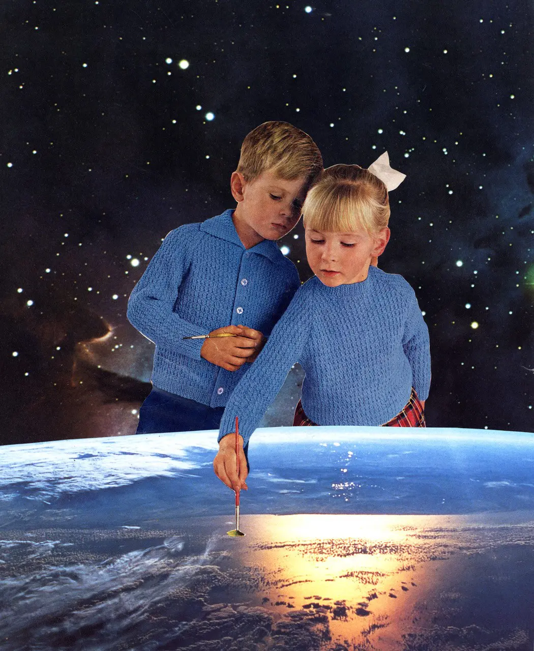 Joe Webb (1976) uses vintage magazines and printed ephemera that he has collected to create simple but elegant hand-made collages, no Photoshop manipulation is allowed. Webb reimagines the imagery using simple and concise edits, transforming the original scene into something altogether more surreal.Â