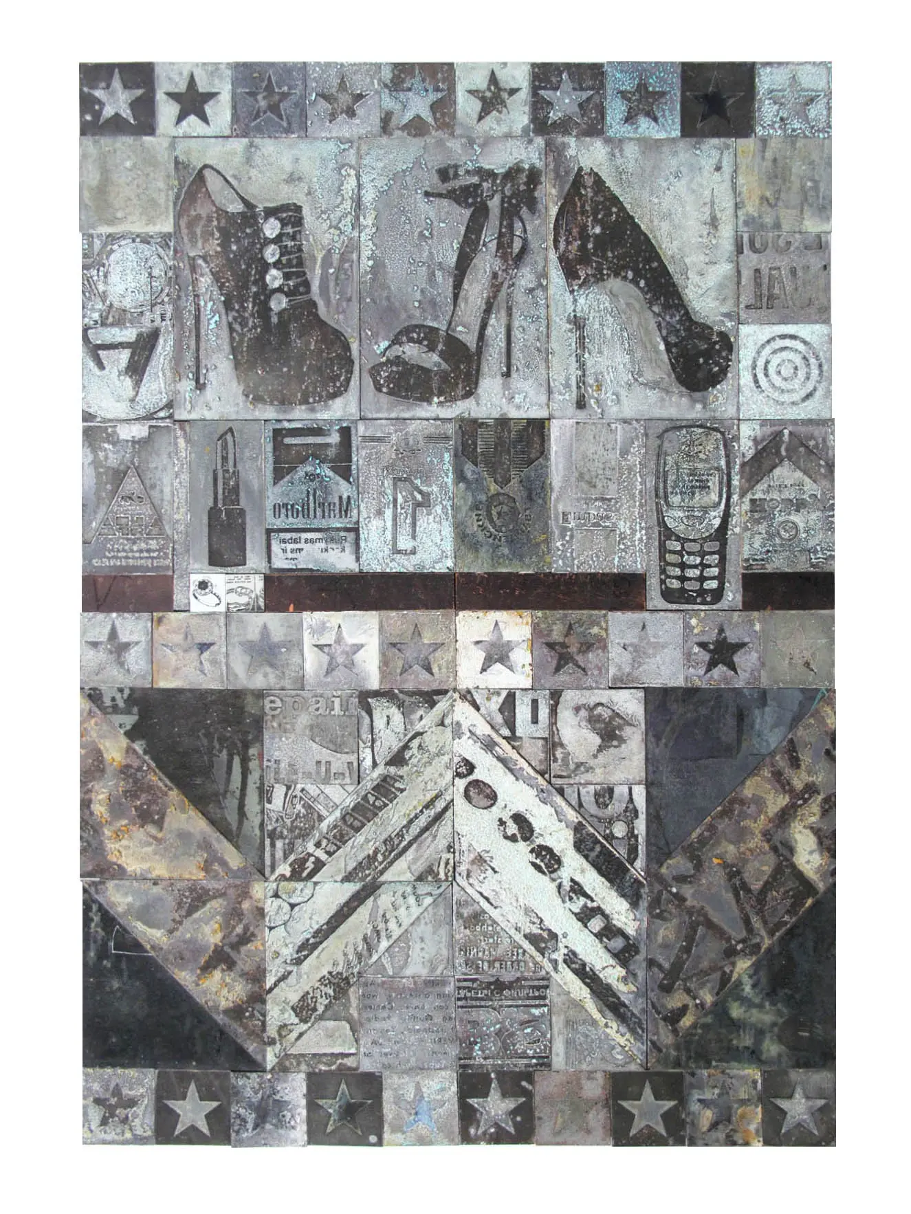 This artwork has been created in the studio utilising etching and corrosion processes on zinc plates which are then mounted onto wood. The resulting colours are natural pigments developed by chemical reaction.