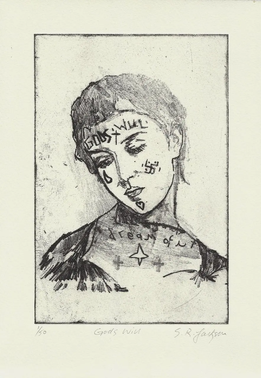 Sam Jackson makes psychological portraits that employ religious signs and symbols in the form of tattoos. Often displaying a melancholy serenity that refers to the poise of subjects in historic religious painting, Jackson’s works are strangely timeless whilst being undeniably contemporary. Crucifixes or swastikas inked onto the surface of the subjects’ skin create a conflict between passivity, aggression, and historic and popular cultures that have adopted branding and propaganda tendencies in order to promote their beliefs.