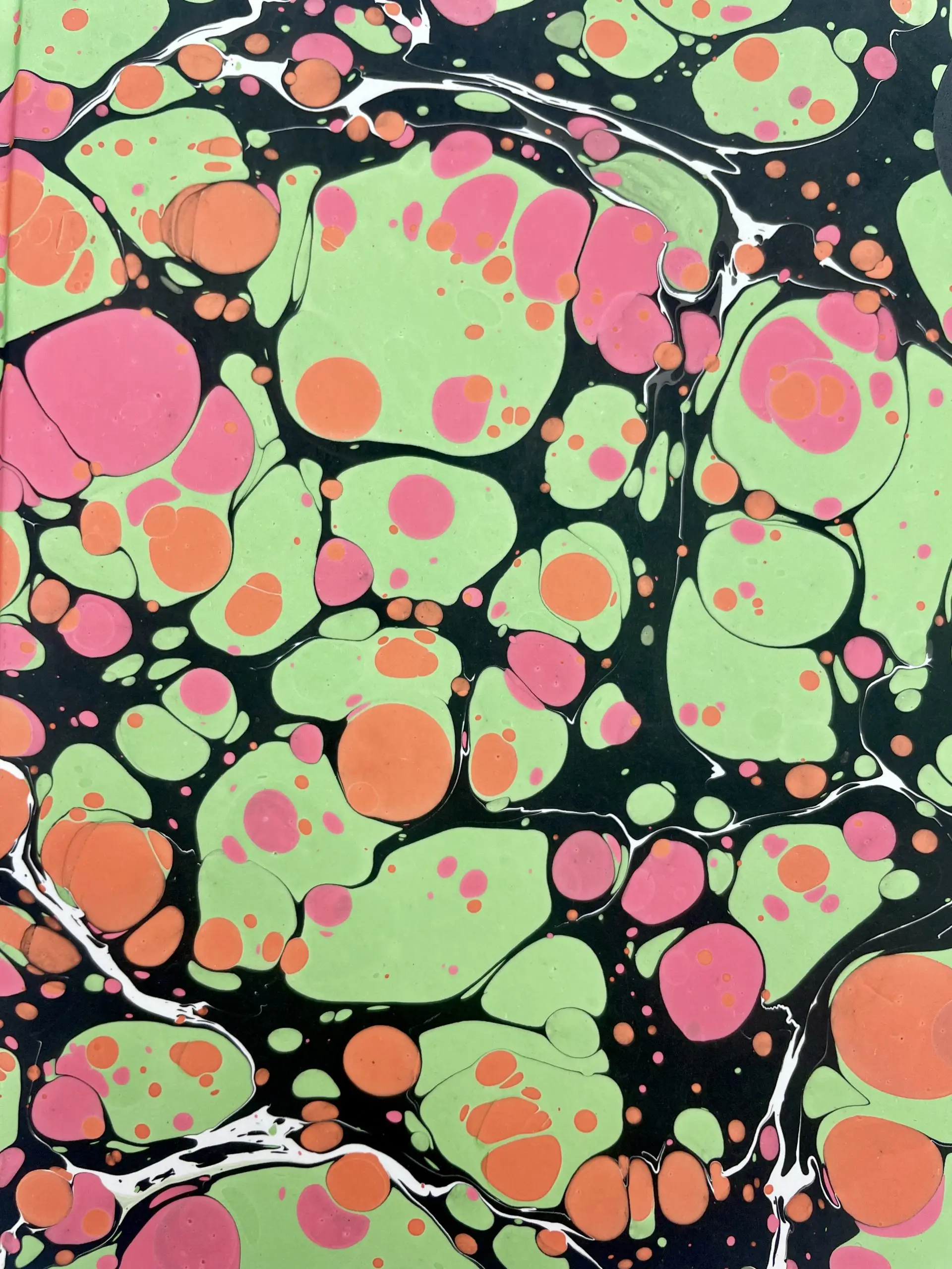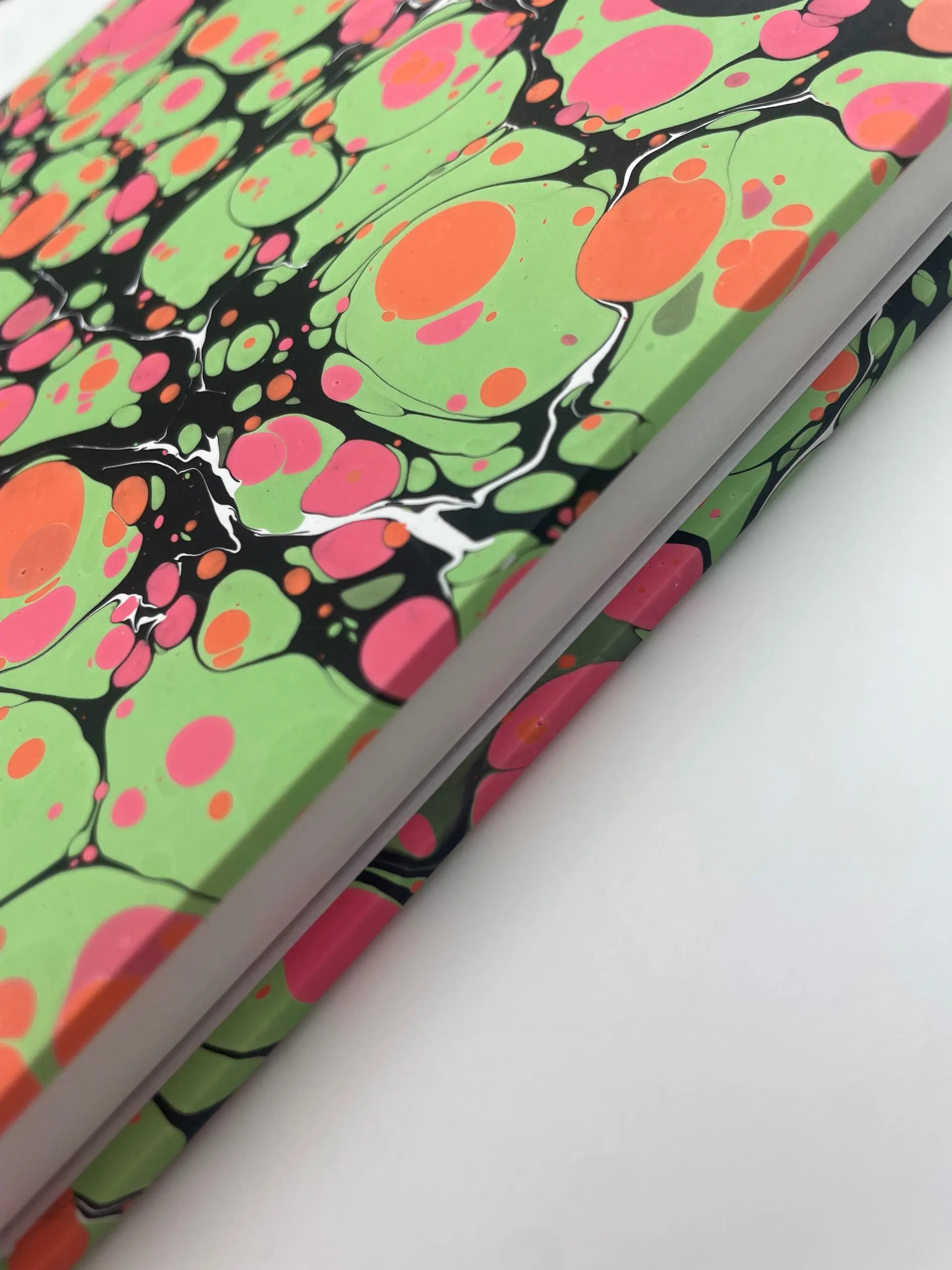 Charlotte uses bold colour-ways and free, fluid movement in her patterns. Each notebook is covered in an original marbled paper, capturing a moment in time in the marbling tray, impossible to recreate.