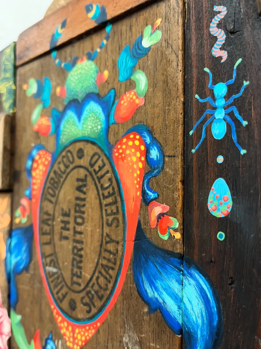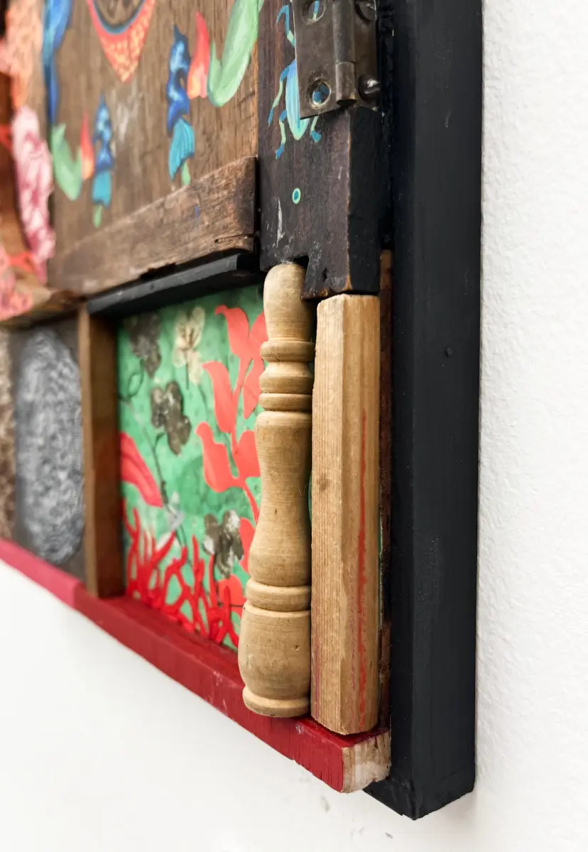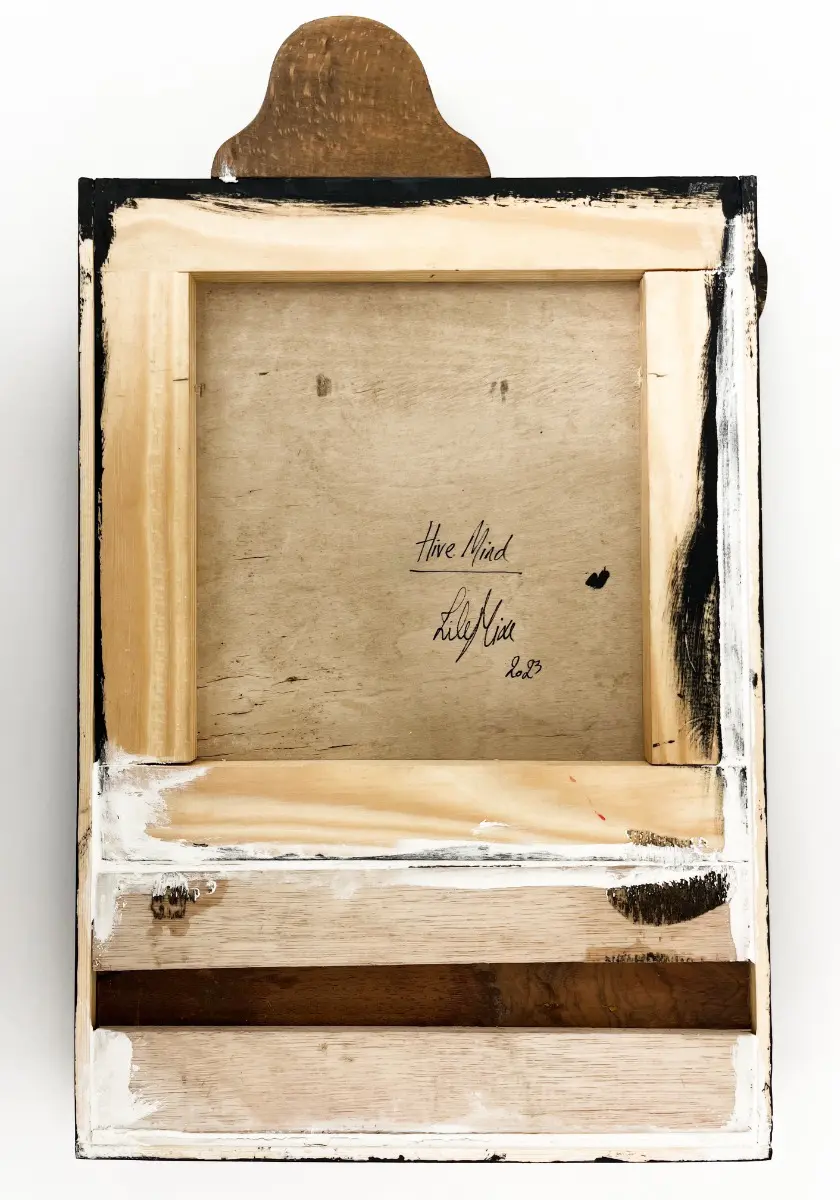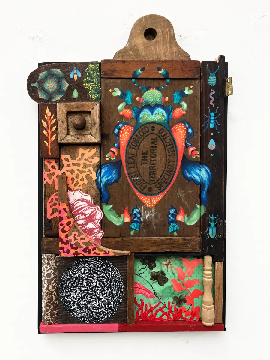 Mixe is inspired by the wonders of nature – including the elegance & intricacy of anatomies; the development of survival techniques, such as camouflage, that also manifest themselves in aesthetically beautiful ways. There is an underlying concern about the future conveyed by the works and a call to action that is becoming more and more urgent. She often uses found materials such as vintage bottles and furniture panels. The distressed beauty of manufactured but obsolete objects is harnessed and juxtaposed with the depiction of sublime fauna.