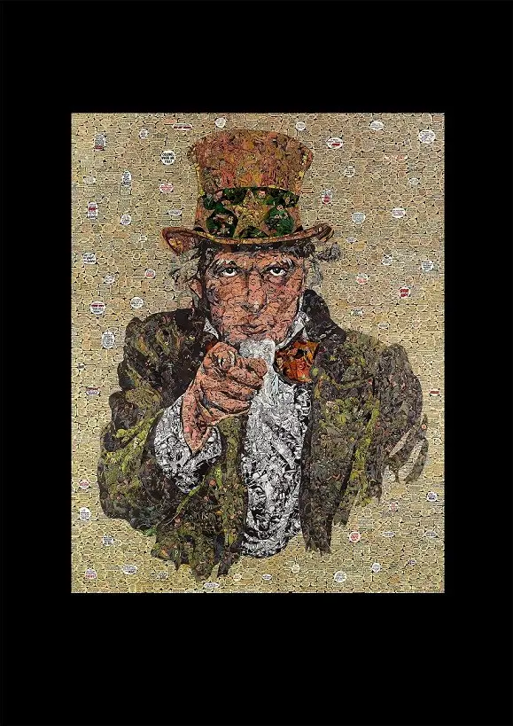 Ben Turnbull is a contemporary pop artist who lives and works in London. Born in London in 1974, Turnbull has been fascinated by American pop culture and comic books since his early youth. Americana is central to his art; working with found objects, including vintage comic books and toys, he creates challenging and provocative discourses on American politics and social ideologies. Having previously worked as a craftsman on the set of film productions, Turnbull’s works are painstakingly made with meticulous detail and precision.