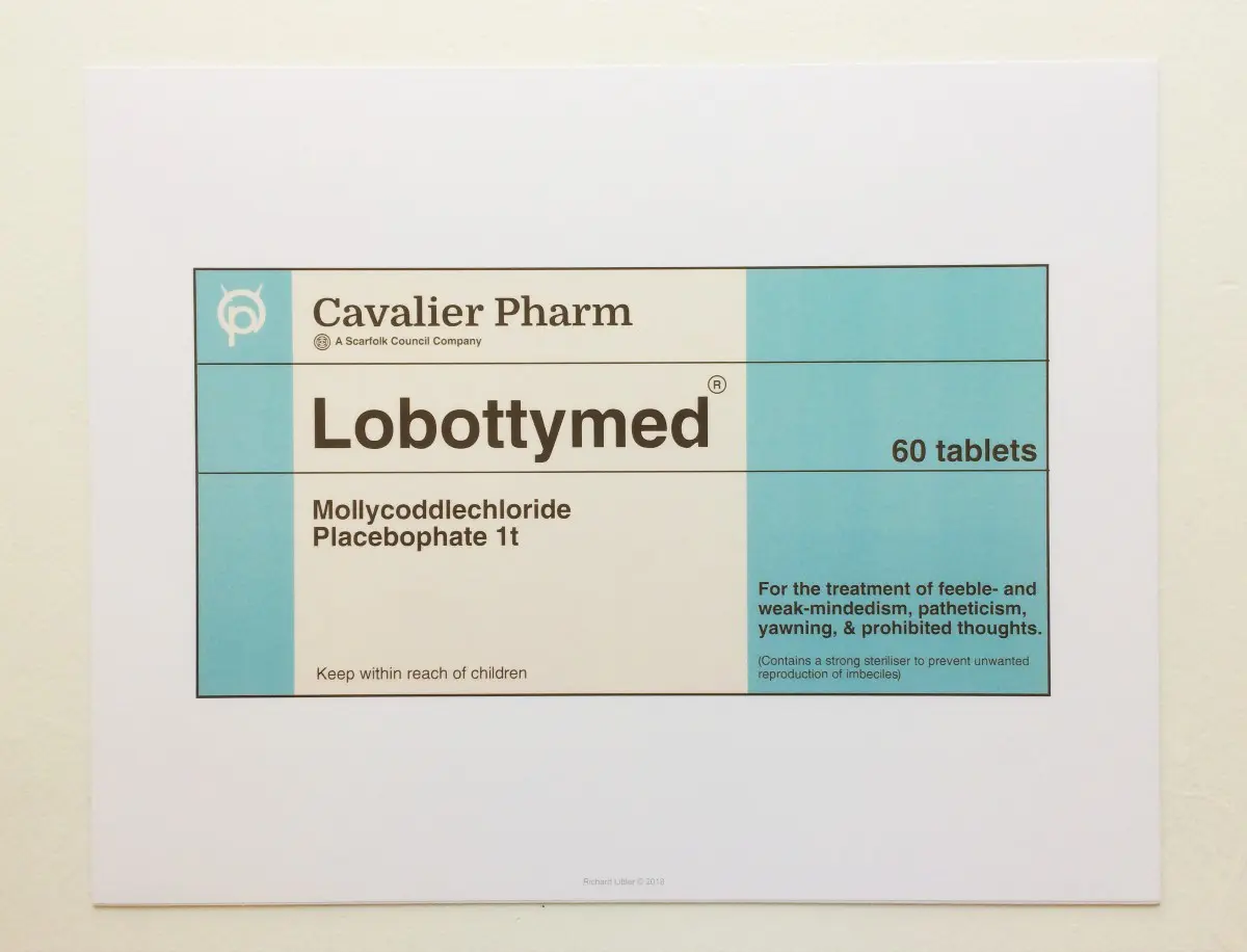 The Scarfolk book records that Lobbtymed is ‘made from a protein released by the brains of surprised simpletons when they are unexpectedly slapped.’