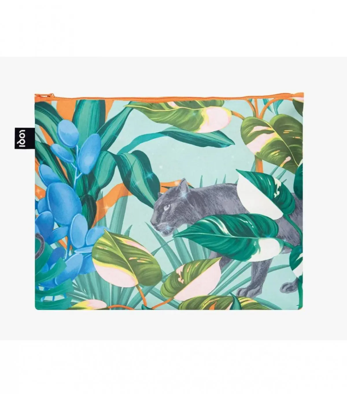 A vibrant floral pattern illustration arranged with typical Thai flowers, fresh foliage and a disguised panther make the recycled zip pockets unique.