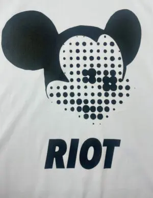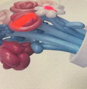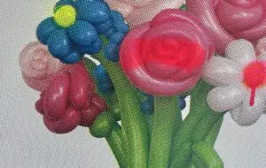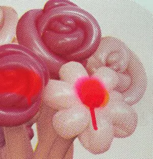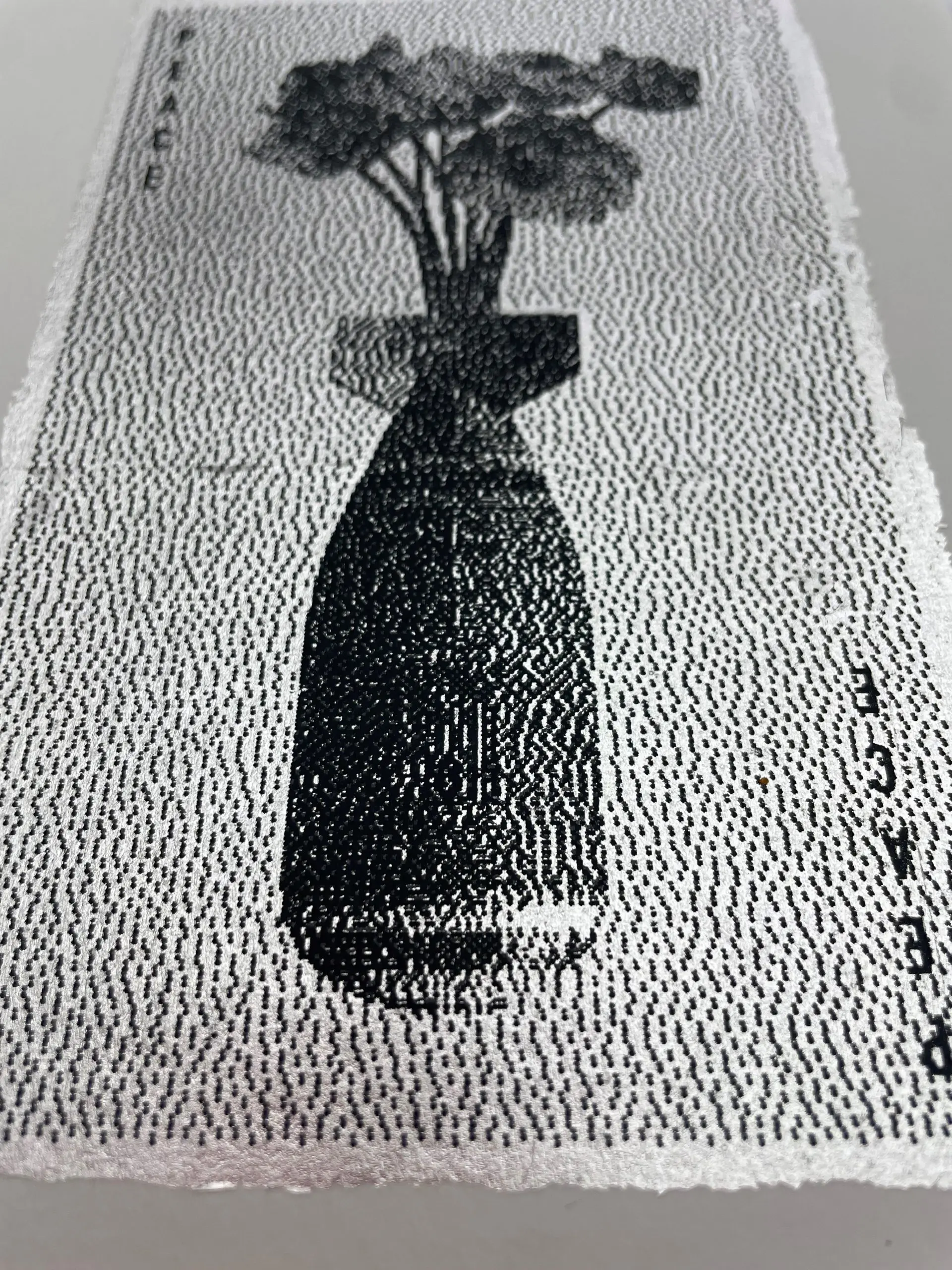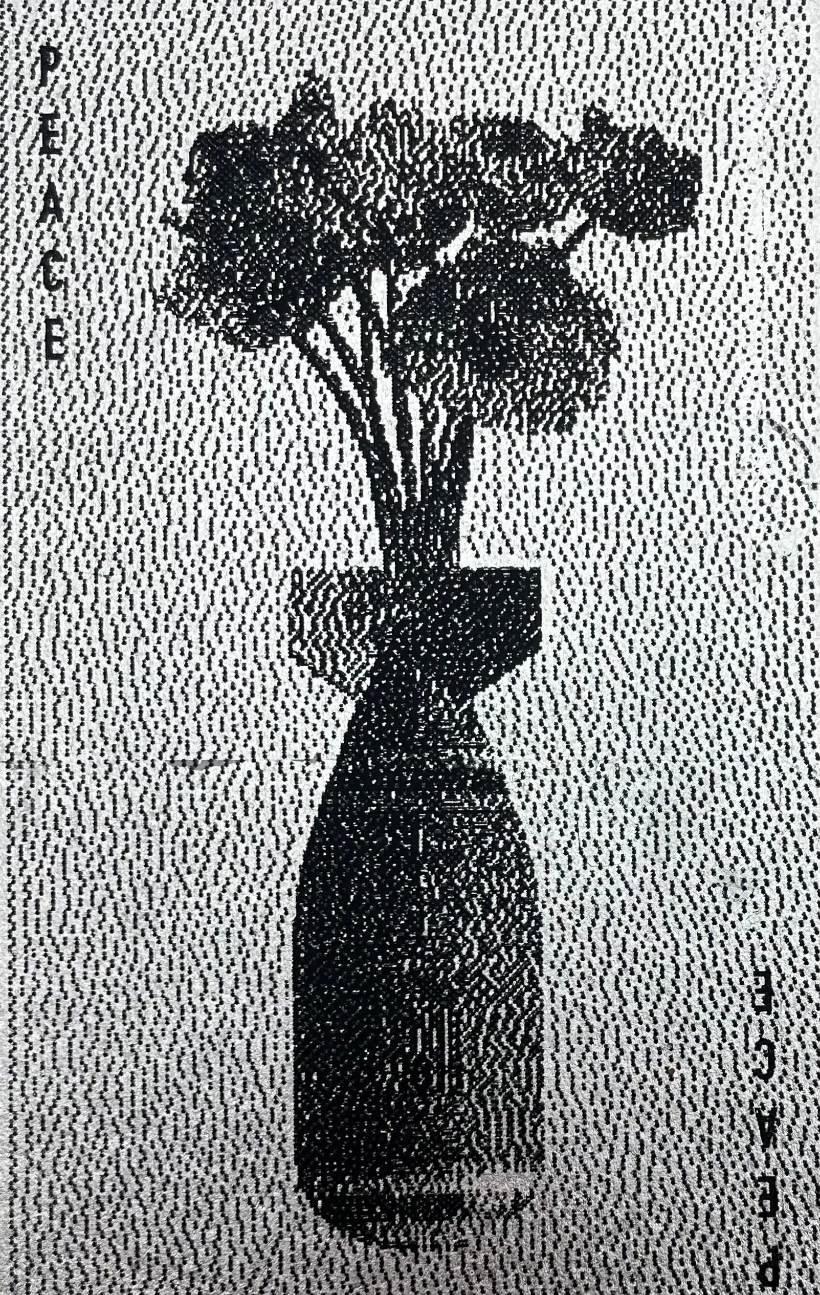 Reversible print. One side depicts what appears to be a bouquet of poppies in a vase. When flipped, it becomes a bomb/missile thrusting upwards into the sky.