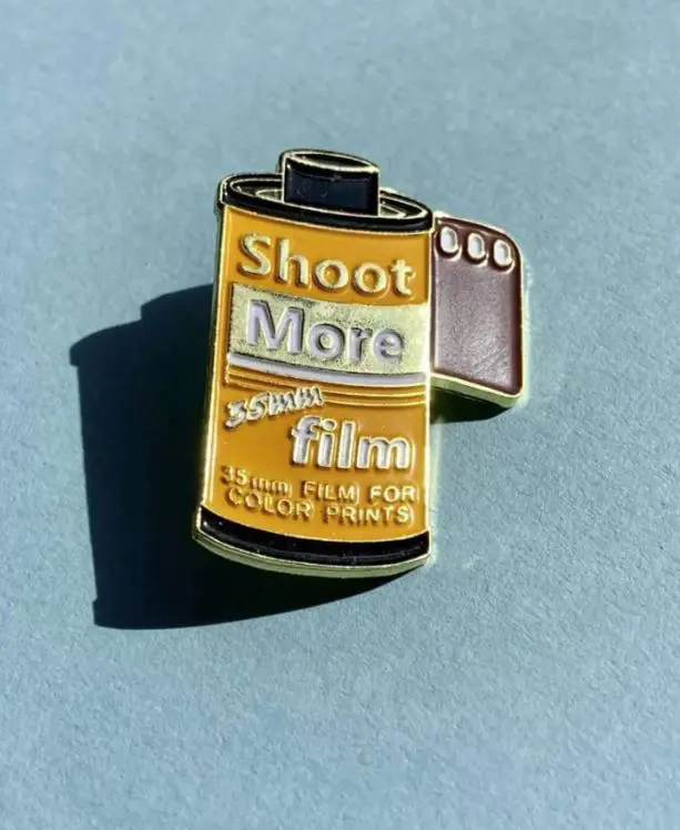 Crafted from silver-plated brass with durable enamel, the pin features a 35mm film canister design with a bold message promoting film photography.