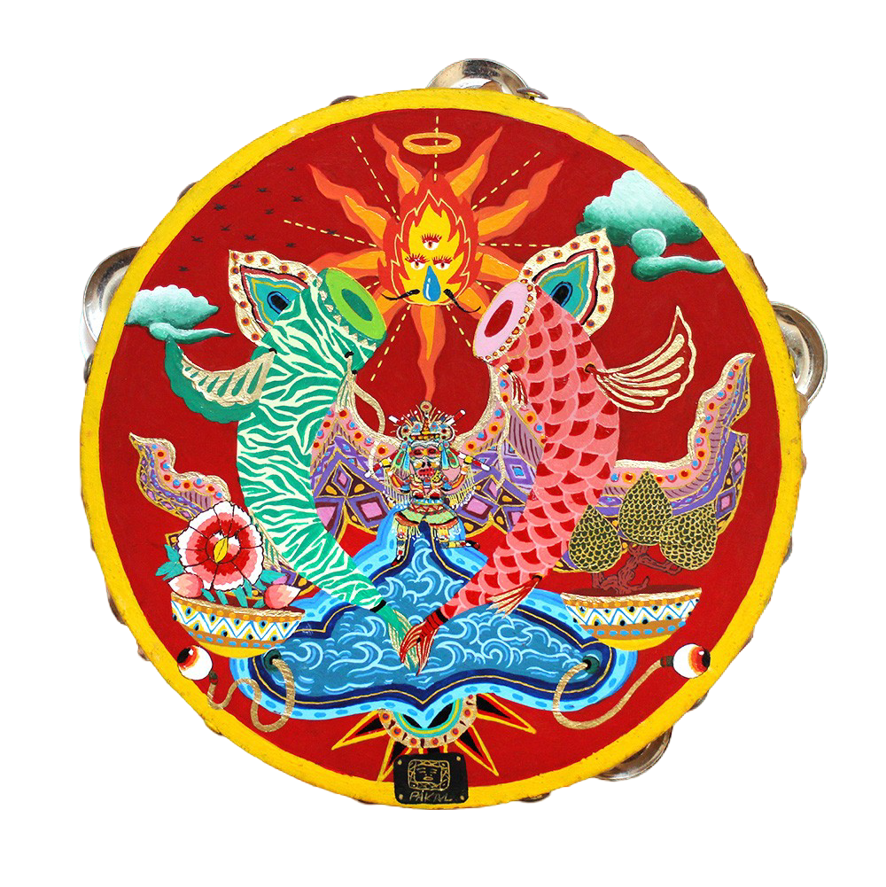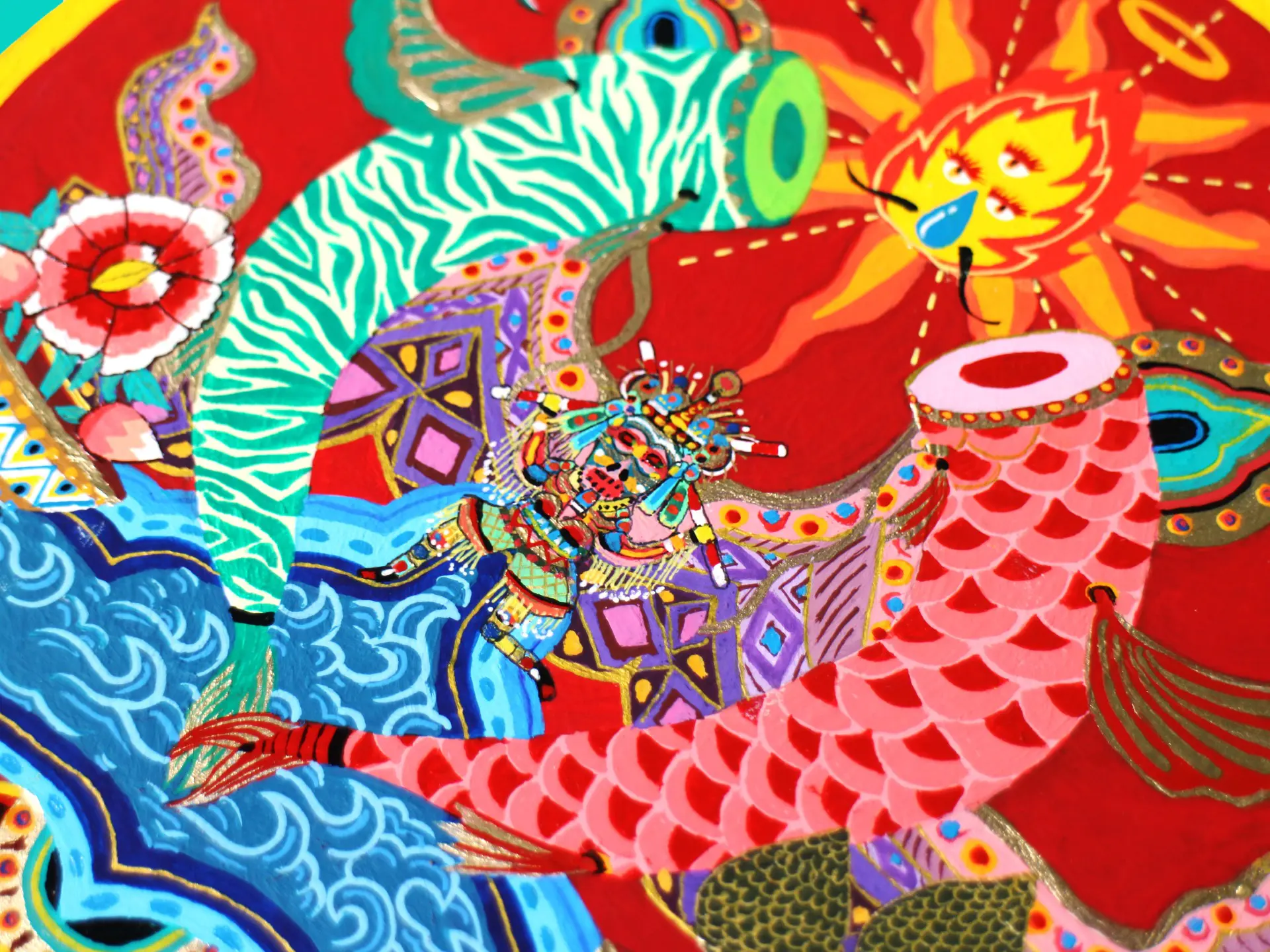 Free from boundaries, borders or labels, the artist invites the viewer to find their own connections with the works. The use of vivid colours, different materials and subject matter connected with the Far East and indigenous art of Central America add to the intrigue.