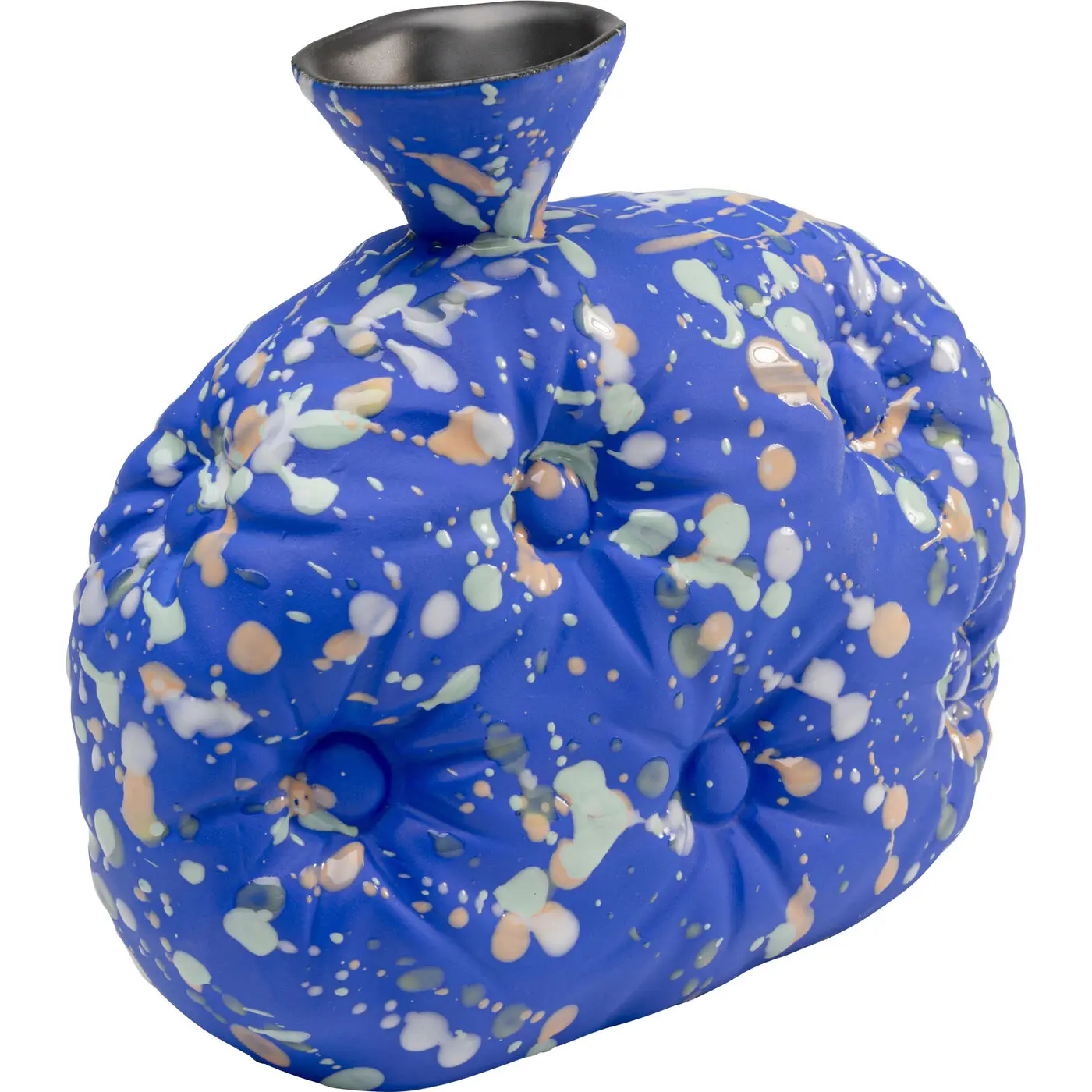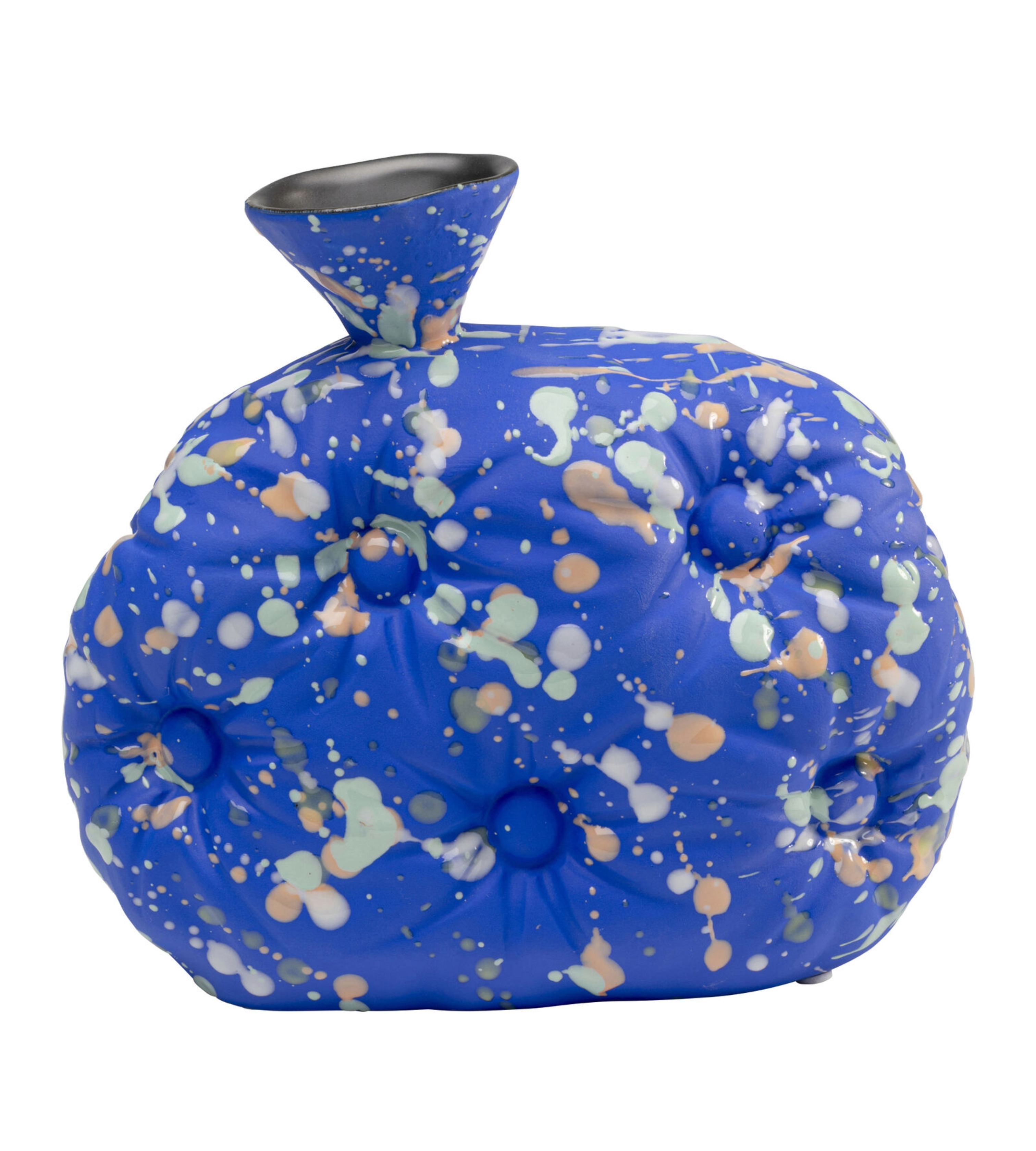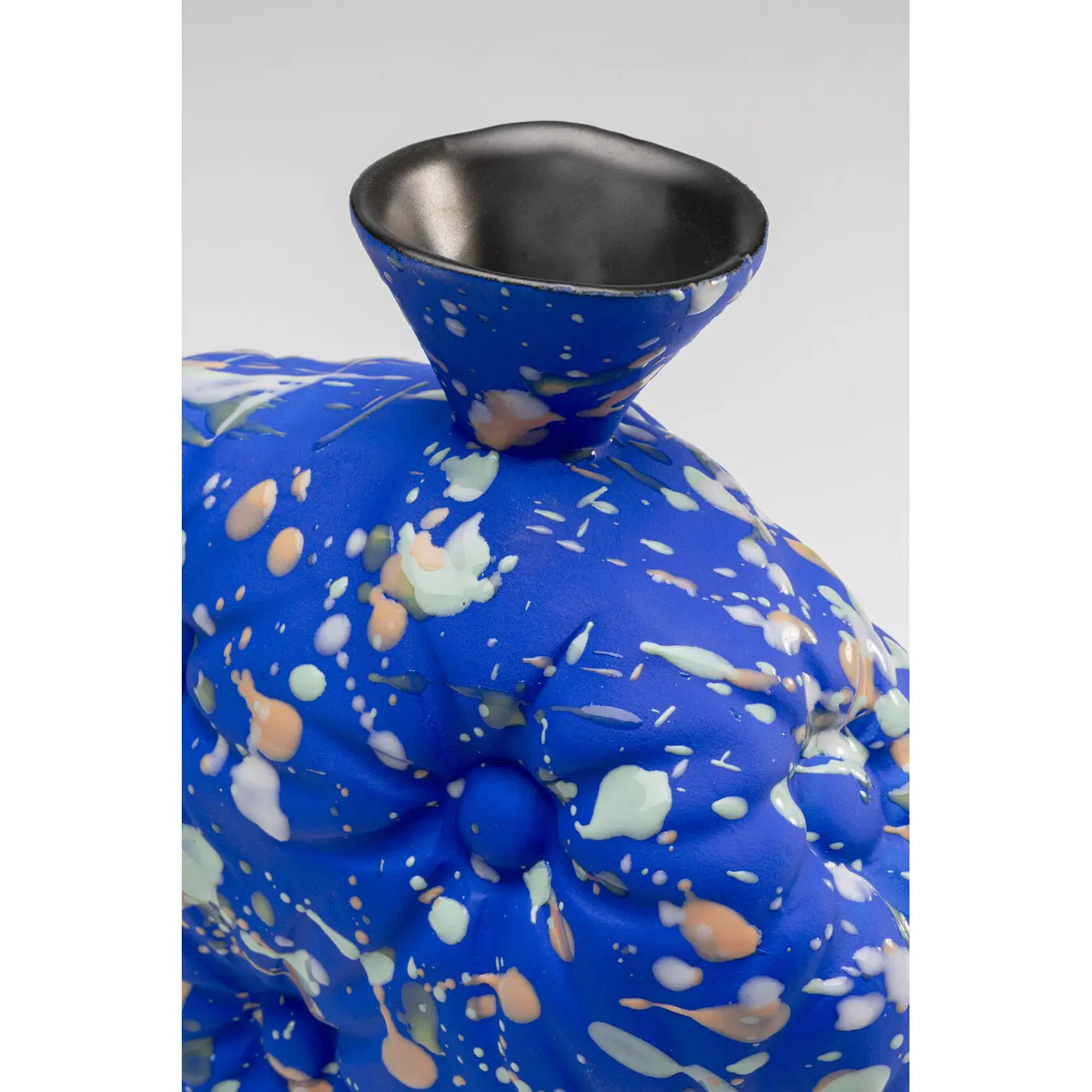 Blue stoneware vase with padded texture effect, featuring splashes of brown and light green paint.