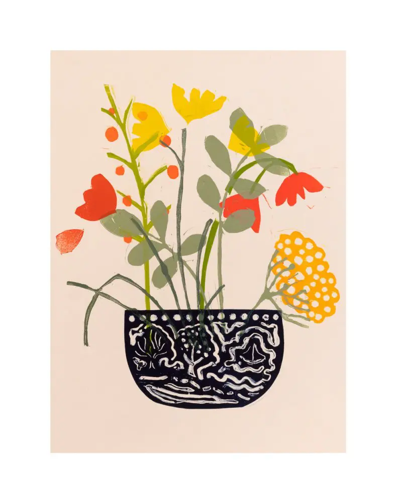Inspired by the paintings of Matisse, this blue and white china bowl brimming with wild flowers is a mono-print, created with many layers of coloured oil paint, laid down on glass and then transferred to paper with pressure. Oil paint on paper.